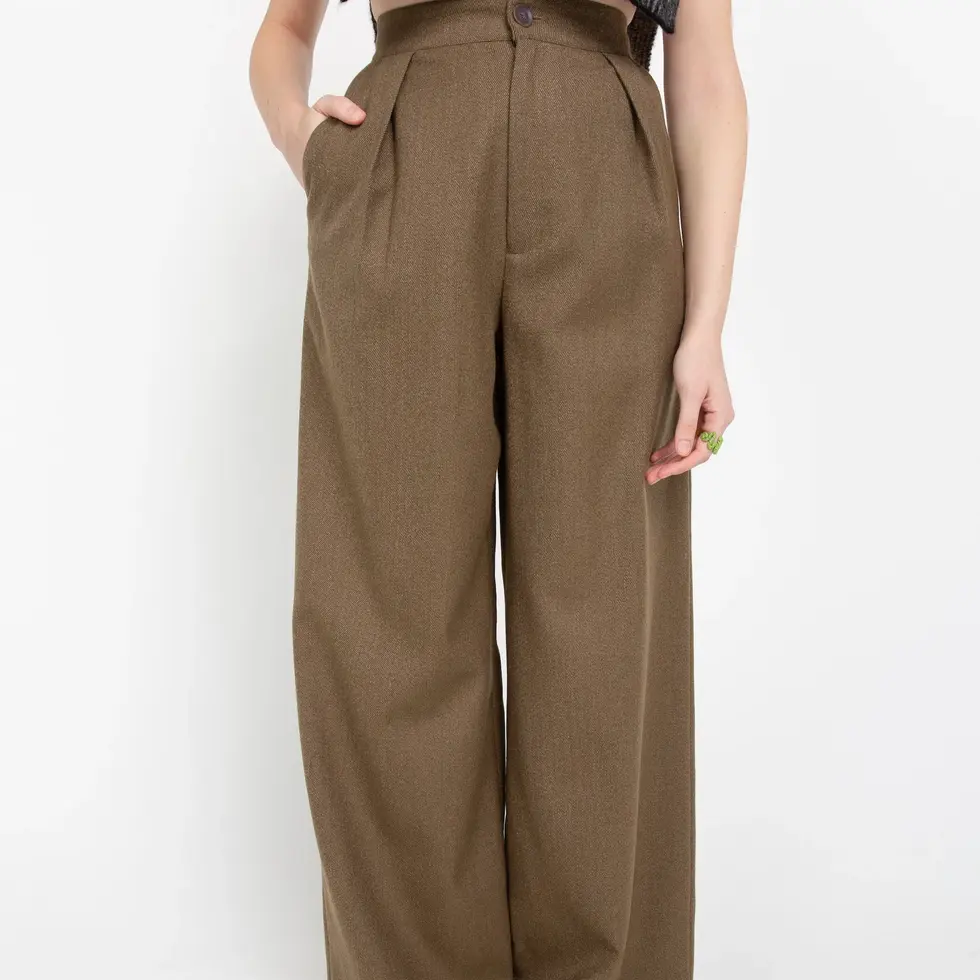 Základní kousek pro váš podzimní a zimní šatník. Kalhoty s vysokým pasem v odstínu khaki hnědé. Mají dvě šikmé kapsy vzadu a dvě kapsy vpředu.